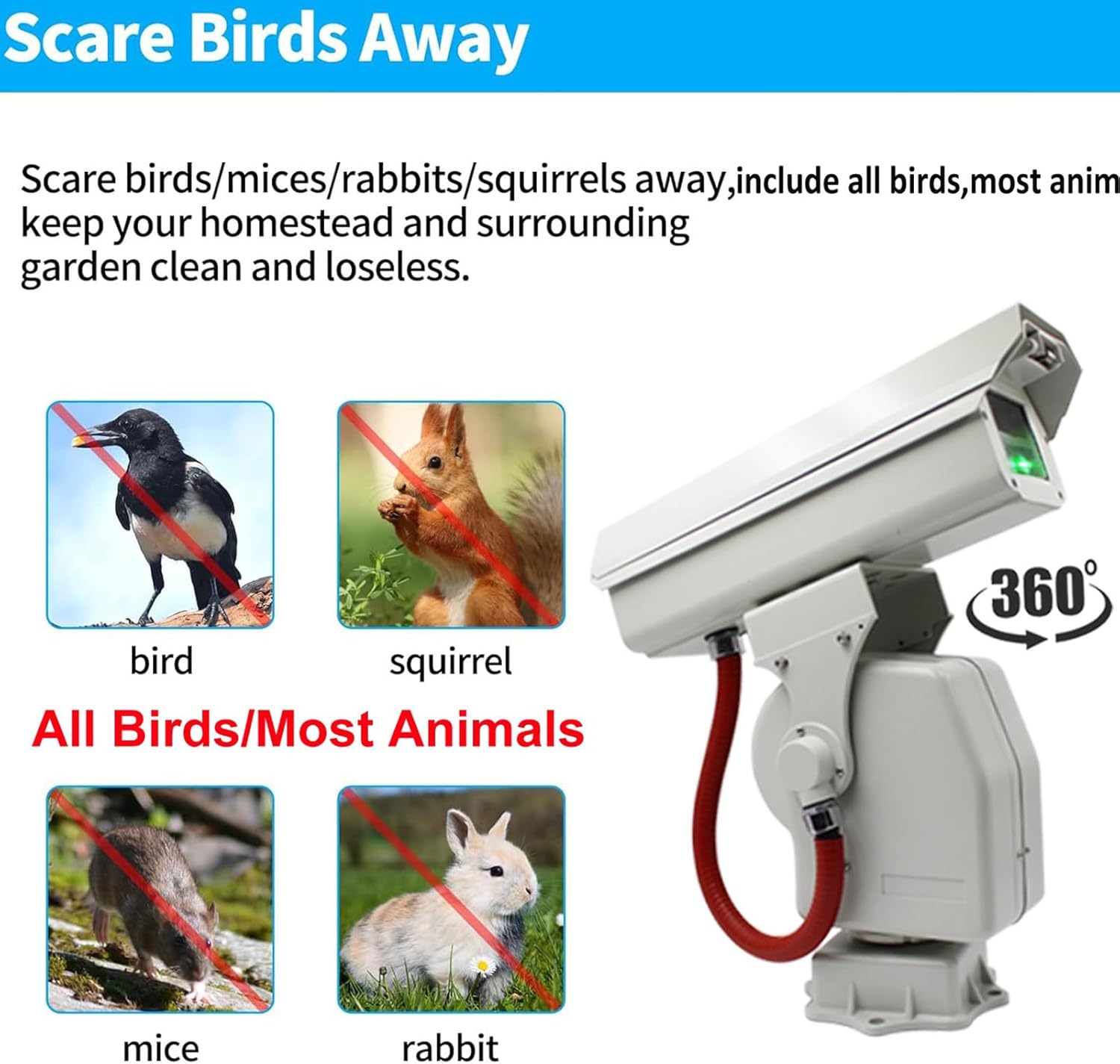 Equipped with high brightness LED lights, the bollard repels annoying birds and a variety of other wildlife without harming them. BIRD CHASER ADVANTAGES: --2W offers wider coverage and wider projection range --High brightness, waterproof and sun-proof --Dynamic linear pattern, fast flashing frequency --Multi-time automatic cruise, control via smartphone APP --Freely adjustable trajectory, 360° angle, a range of more than 1000m --For birds/rabbits/squirrels, including all birds and most animals --Completely silent, enjoy a quiet space and no noise PRODUCT SPECIFICATIONS: Housing Material: Aluminum Alloy Operating voltage: 12V-DC Power Consumption: 24W Horizontal rotation range: 0°-360° continuous rotation Vertical rotation range: 20°-85° (factory setting) Horizontal rotation speed: 0.1°-9°/S variable speed Vertical rotation speed: 0.1°-5°/S variable speed Presets: 80 settings and called Cruise Preset: Supports 1 Group Self-test when switched on: Automatic self-test after power on. Light source: 525nm 1W/2W green light source Divergence Angle: Straight Line (A) 20°, Star (B) 120° Spot: straight lines (A)/full of stars (B) Working environment temperature: -15°-60° Protection rating: IP66 SHIPPING LIST: Automatic Bird Tracker x1 5m power cord x1 Adapter 12V/2A or 12V/3A x1