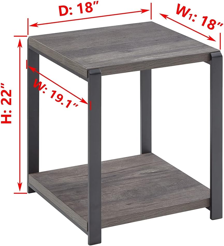Anti-Skip PadsEach leg has anti-skip pad to protect your floor from the damage. More Storage Space The Top and bottom open shelf provide extra display space for knick-knacks or photos. Excellent for Small Space Compact size design makes a limited space comfortable,lightweight design makes this side table easy to move to everywhere. SPECIFICATIONS: Color: Grey Material: MDF, Metal Tube Frame and Wood Grain Product Size: 19''W x 18''D x 22''H Product Weight: 14.5 LBS Load Capacity: Each shelf can hold 200 lbs Package: Package: 1 x End Table, 1 x Assembly Instruction, 1 x Hardware